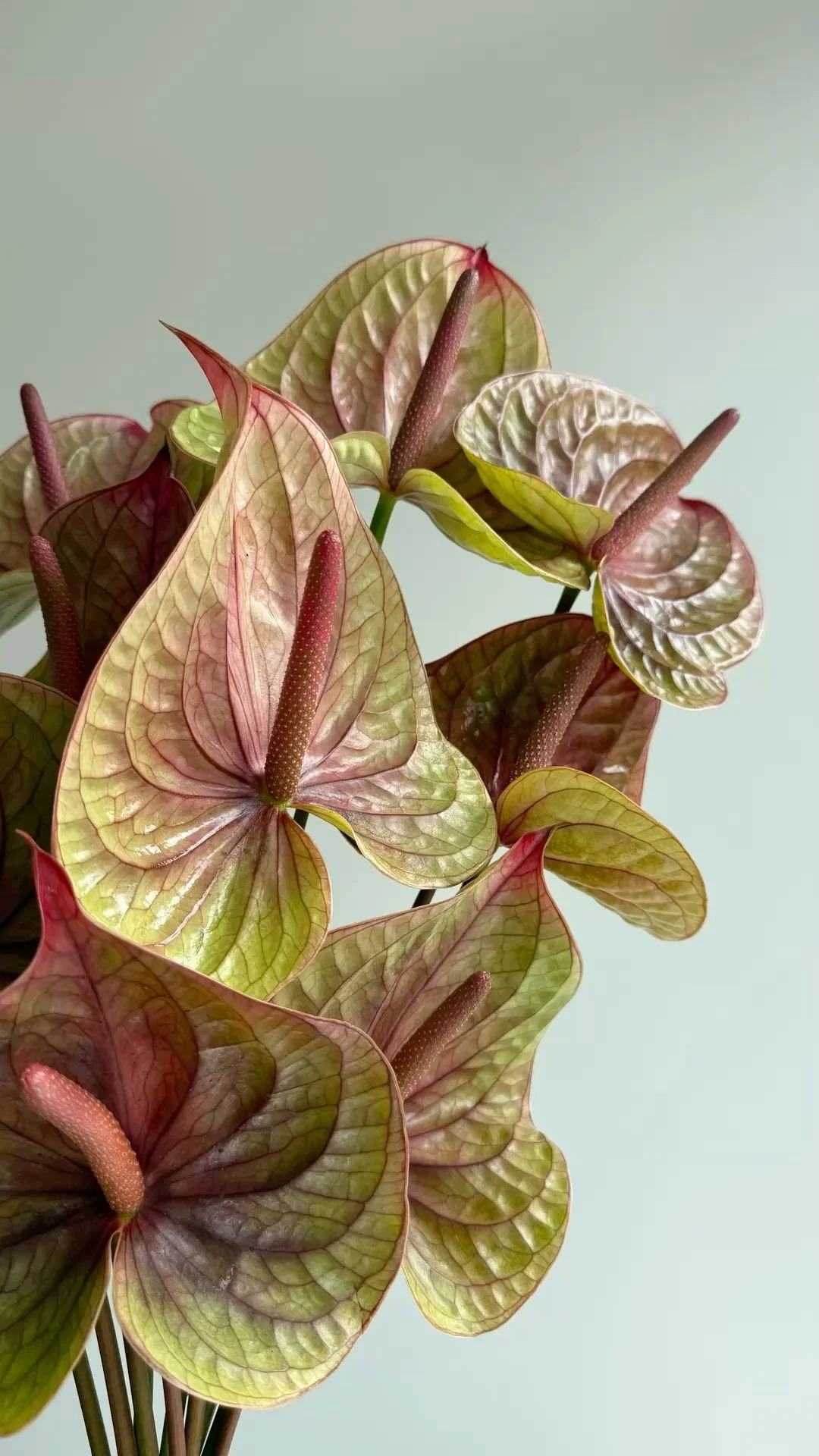 Close-up of colorful anthurium flowers with pink, green, and yellow hues against a plain background.