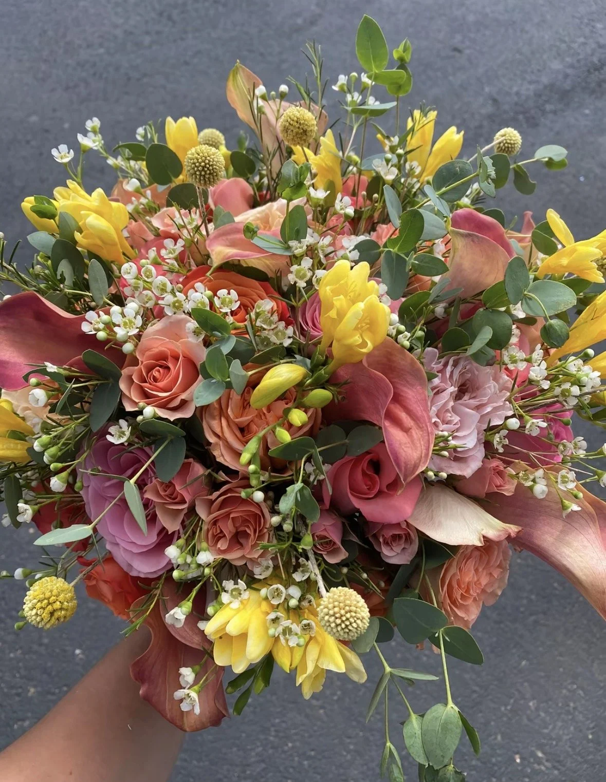 A colorful bouquet of various flowers including white, pink, purple, yellow, orange, and deep red blossoms.